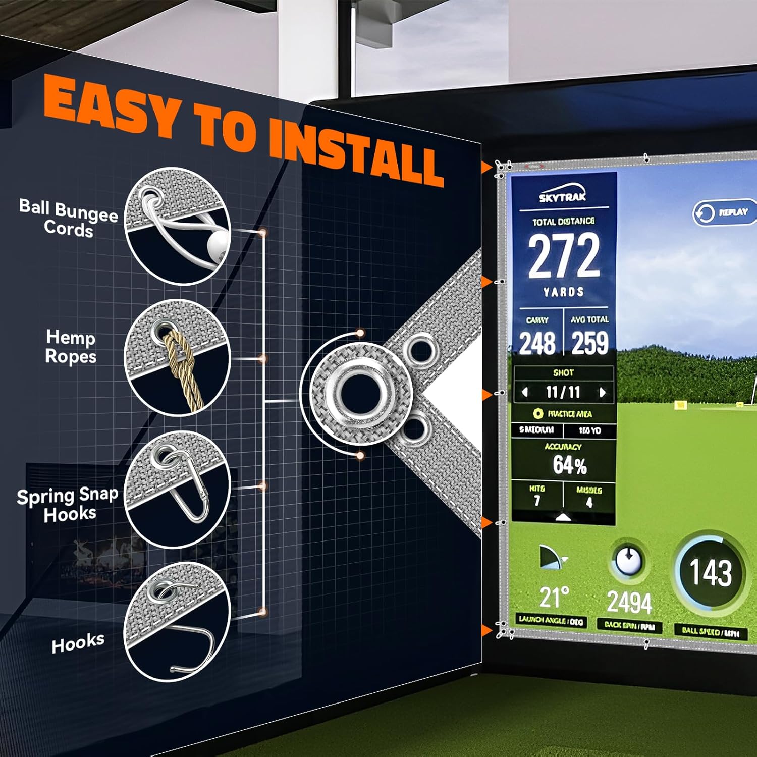 • Portable and Easy to Install: Elevate your golf practice and entertainment experience with our foldable golf screen, perfect for use in the garage, at home, or in the backyard. The impact screen features 34-48 grommet holes around the border for easy installation and comes with 20 ball bungee cords to securely fasten the screen. This versatile screen is also great for watching movies and sports events. Choose from 4 size options to fit your training space and needs.