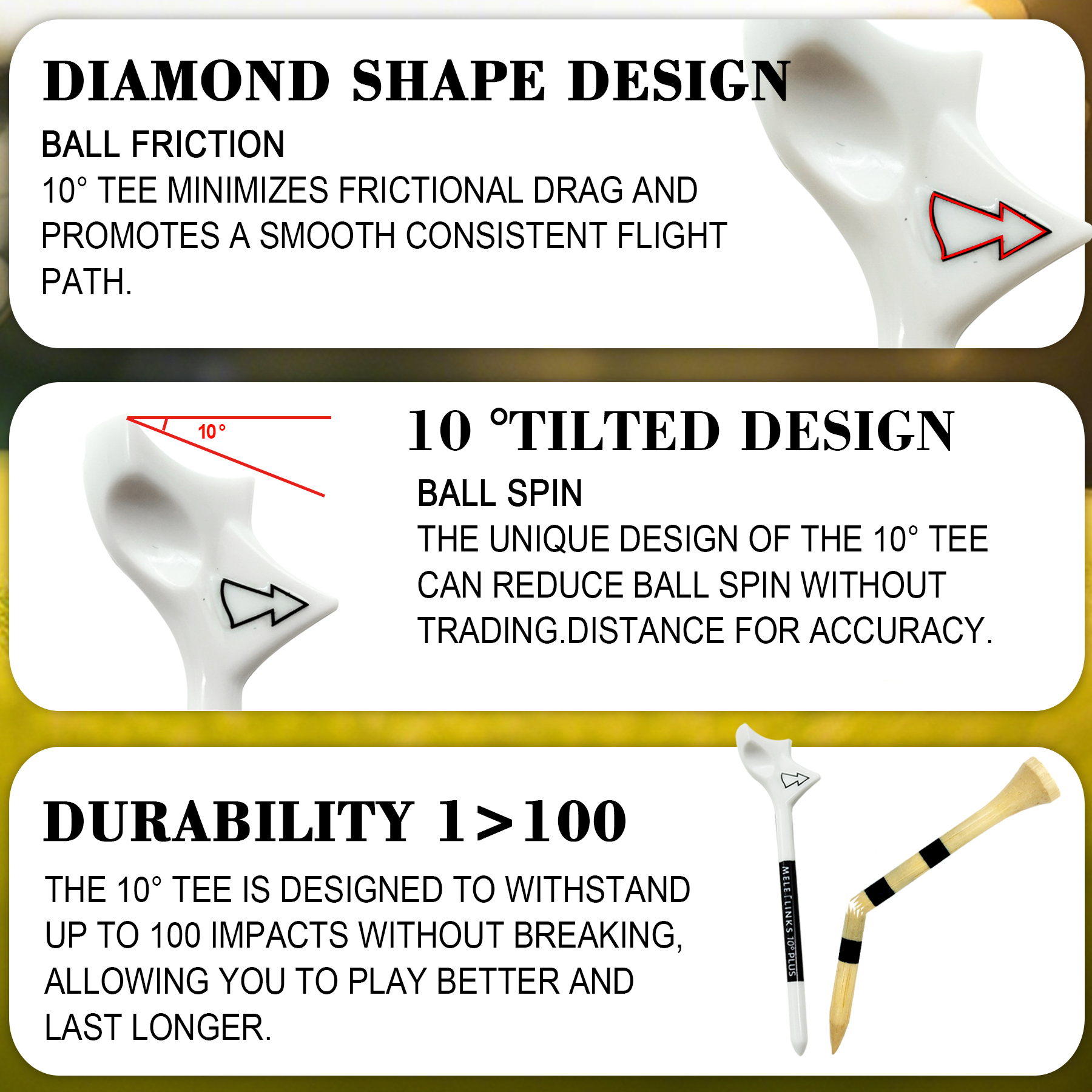 👉SUPER STURDY AND RELIABLE TEES: Compared with ordinary wood Tee, the design of Tee can withstand up to 100 impacts without breaking, Play better .